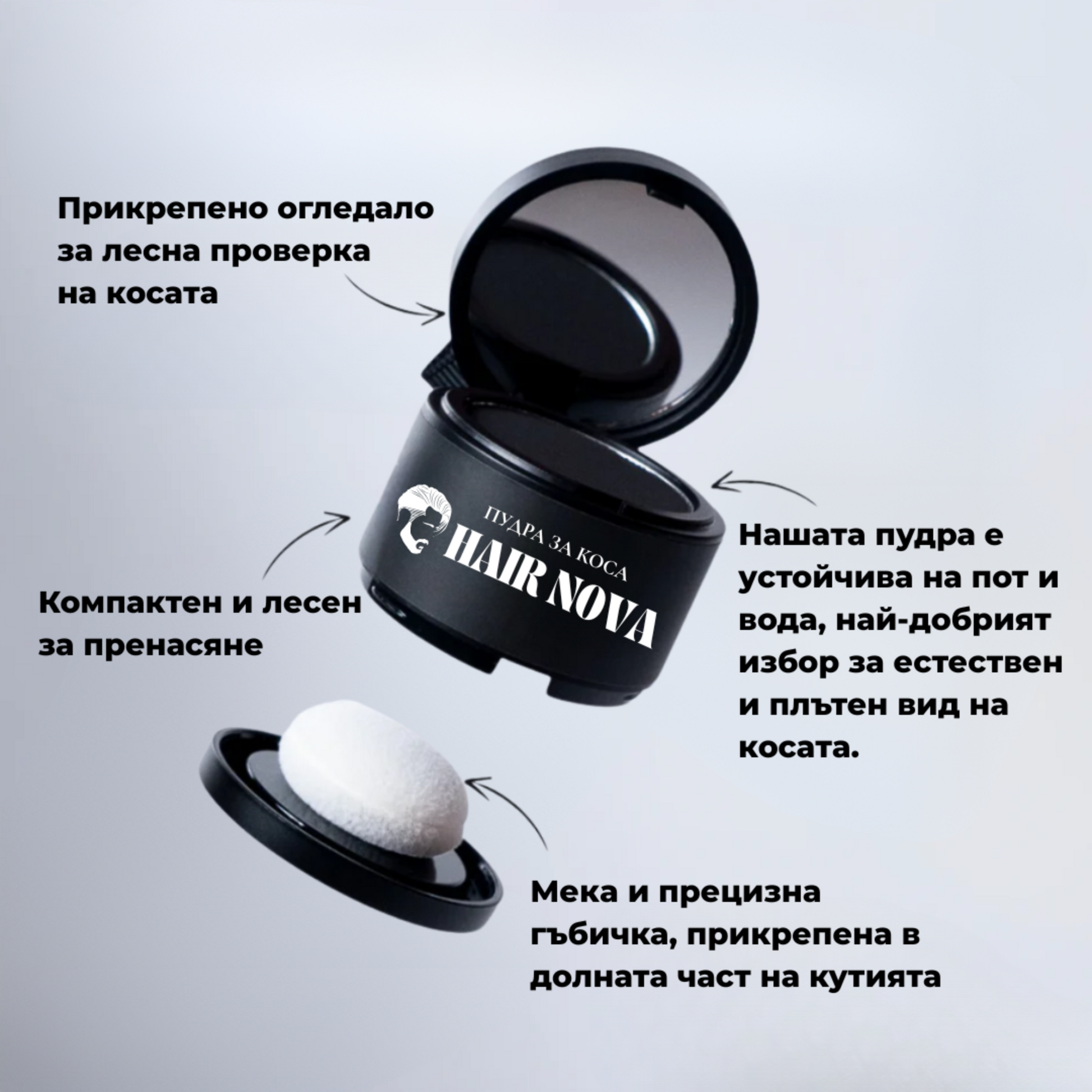 Представяме ти HairNova — пудра, която мигновено прикрива оредели участъци по косата, скалпа или брадата, и ти връща плътния и естествен вид.
